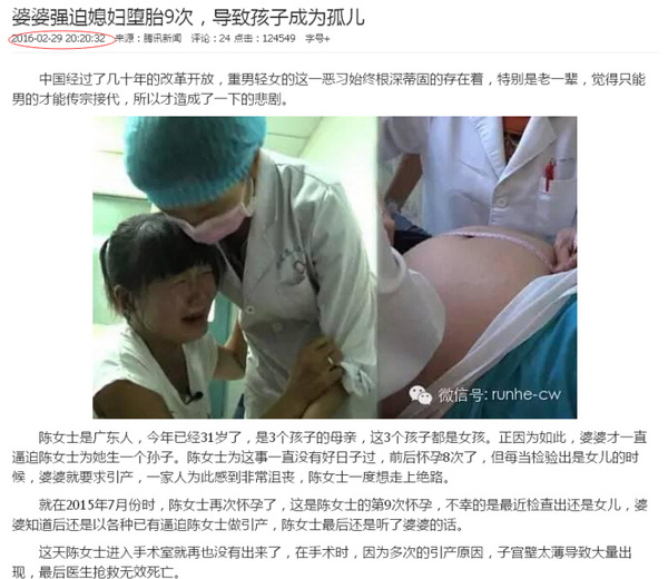 为生男孩婆婆逼媳妇堕胎9次致死?