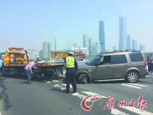 昨日上午,记者赶到现场,肇事车辆为粤E牌照的越野车,正横停在广州大桥北往南车道中间,交警正在指挥拖车将该车拖离现场,该越野车的左前车轮胎已爆掉,车头也受损。广州大桥中间超过10米距离的护栏也被撞掉。