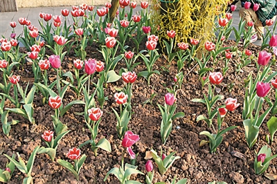花海广场大片的各色月季相互辉映,美女樱、月见草、火星花、天竺葵、玉簪、曼陀罗等特色花卉如繁星点缀,争奇斗艳。目前,园内的海棠、玉兰、郁金香、桃花和李花已经大面积盛开。