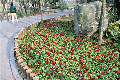 据统计,园内主要栽植黄葛树、香樟、罗汉松、桂花等常绿树木,布置以紫薇、红叶李、贴梗海棠、樱花、含笑等开花植物,品种丰富,数量繁多。目前盛开较多的是贴梗海棠和樱花。
