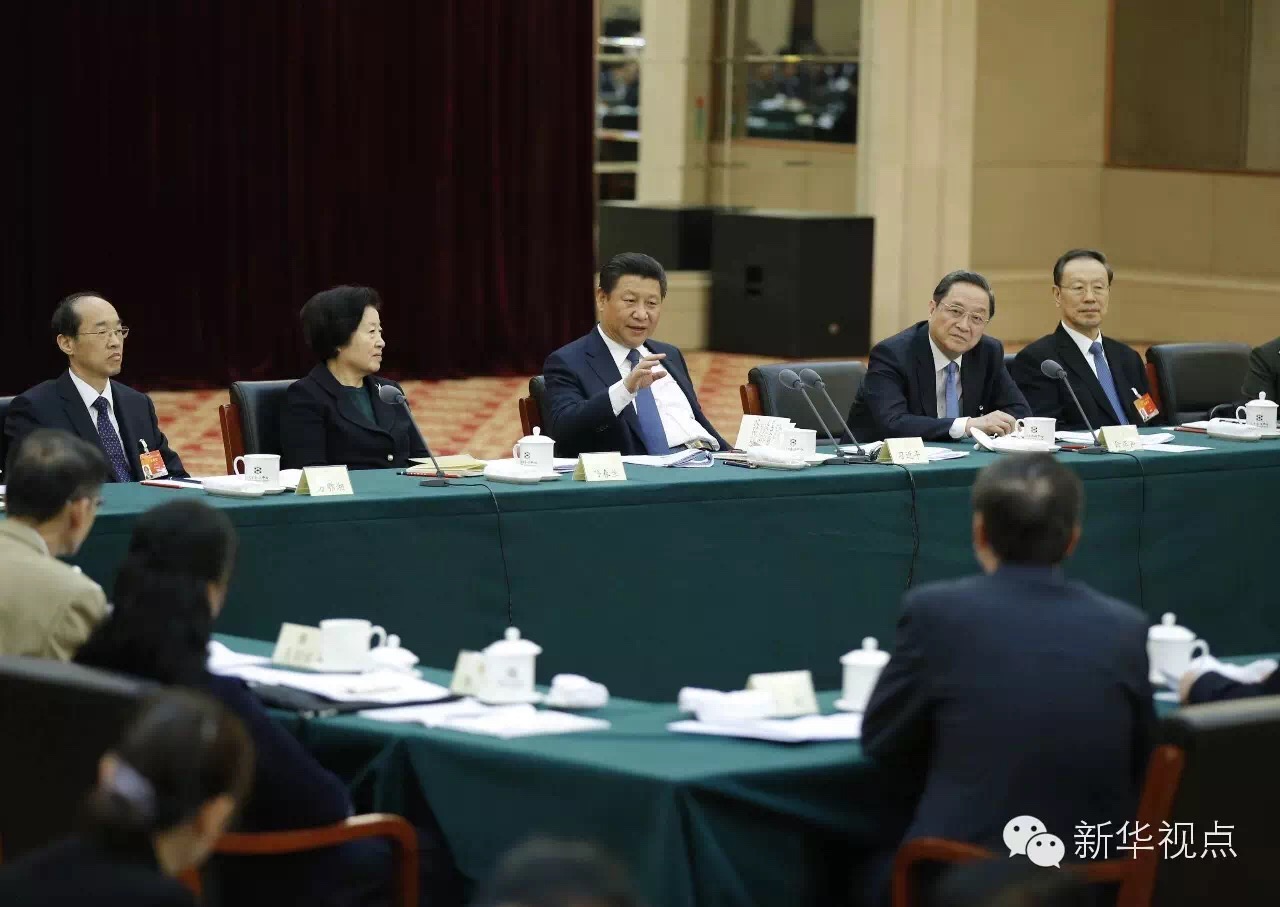 2015年3月5日,习近平参加十二届全国人大三次会议上海代表团的审议。他说,要择天下英才而用之,实施更加积极的创新人才引进政策,集聚一批站在行业科技前沿、具有国际视野和能力的领军人才。 新华社记者黄敬文摄
