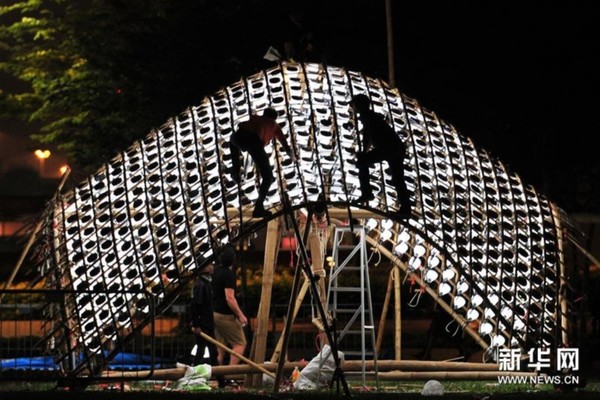 3月2日,工作人员在新加坡滨海湾举行的“照亮滨海湾”灯光艺术展上为挪威艺术家斯内赫塔的作品《灯罩》做准备工作。新华社发(邓智炜摄)