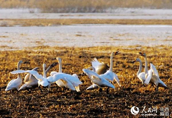 人民网朔州3月4日电 近日,随着山西省气温的大幅回升,朔州市太平窑水库、下米庄水库迎来了第一批南下渡冬返回的800多只天鹅、大雁。(乔慧、金边赤摄)