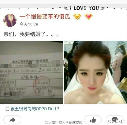 昨天,@河南科技大学微博校园 透露,该校土木工程学院一名大二男生请假3天,回家结婚去了!对,你看没错!新娘子还多漂亮的。
