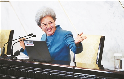昨天,十二届全国人大四次会议在北京人民大会堂举行新闻发布会。大会发言人傅莹就大会议程和人大工作相关的问题回答中外记者的提问。在101分钟里,傅莹回答了18家媒体记者提出的问题,覆盖贪腐治理、立法计划、民生等多个领域。摄影/本报记者 袁艺