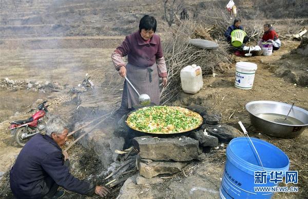 3月4日,河北邯郸市涉县后池村村民在修路现场准备午饭。 2015年入冬以来,河北邯郸市涉县后池村村民利用农闲时间自发义务出工修筑通往梯田的山路,以便能在山坡梯田种植核桃、花椒实现增收。他们如“愚公”般带锅灶上山劳动,将6公里长的小路拓宽成3.5米宽的大路。新华社记者 范世辉 摄