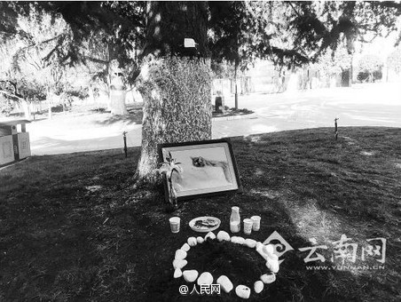 几名学生在一棵树下用鹅卵石为它建坟,还放上了猫粮和画像。