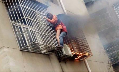 春节期间湖北一居民家着火,一女子被防盗网困住,快递员张洋徒手爬楼撞开防盗网,救出女子。