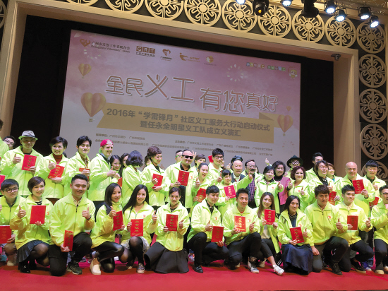 昨天是学雷锋纪念日,以“全民义工,有您真好”为主题的2016年“学雷锋月”社区义工服务大行动启动仪式暨任永全明星义工队成立汇演隆重举行。50余名本土明星义工现场义演,为广州市社区义工发展基金筹款。