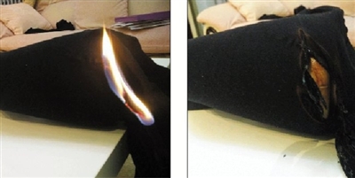 灯芯绒遇火迅速燃烧(左)以及灭火后(右)。