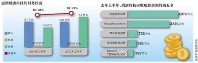 下游客户回款的困难,又让展唐科技雪上加霜。2015半年报显示,展唐科技的应收账款从5323万元升值9760万元,翻了将近一倍。在2014年6月,该数字还仅为1457万元。2015上半年,展唐科技的资产负债率也已高达87.48%。