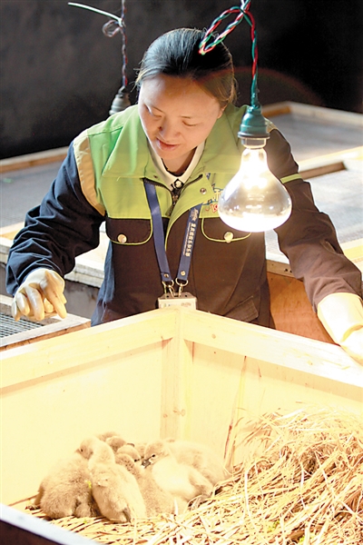 黑天鹅在室外自然孵化这段时间,饲养员每天都会守在其身旁,确保不出现其他意外情况。不过,园内部分黑天鹅是第一次当妈妈,照顾小孩经验不足,加上园区有黄鼠狼会偷食小天鹅,为保证小天鹅的安全和成活率。在它们出生的第二天,饲养员就把小天鹅们带到专门的饲养点,精心照顾。