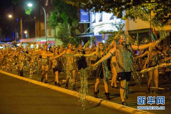 图为同性恋游行队列行进中当日,悉尼同性恋狂欢节花车游行盛大举行。新华网发(朱宏业摄)