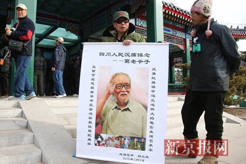 其中,一位风尘仆仆的中年男子,因不能进入礼堂,只得远远隔着大门,望着葛老的方向连磕三个响头,黯然离去。据记者了解,他姓刘,得知葛老的告别仪式在今早举行,他此次专程从安徽淮北连夜坐火车赶来,“我就是想跟葛老磕个头,看过他演得很多电影,他是值得我们尊敬的老艺术家”。还有群众高举牌子,写着“四川人民沉痛悼念葛老爷子”,以此表达对葛老的怀念,他说:“现在一场电影五、六十块钱,是我一天的饭钱。我曾是葛老师最早的一批观众,可惜现在再也不能尽情的看电影了,再也看不起了。”