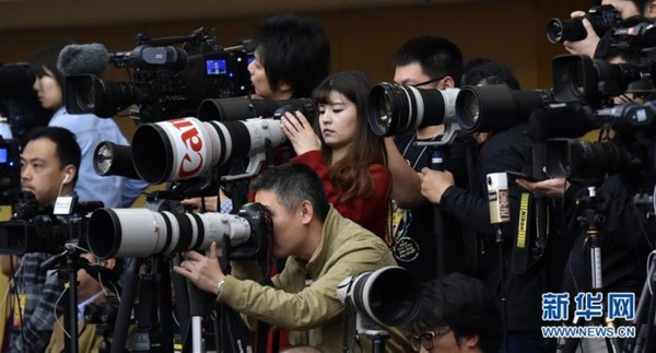 3月8日,十二届全国人大四次会议新闻中心举行记者会,邀请外交部部长王毅就“中国的外交政策和对外关系”的相关问题回答中外记者的提问。这是记者采访拍摄。新华社记者赵颖全 摄