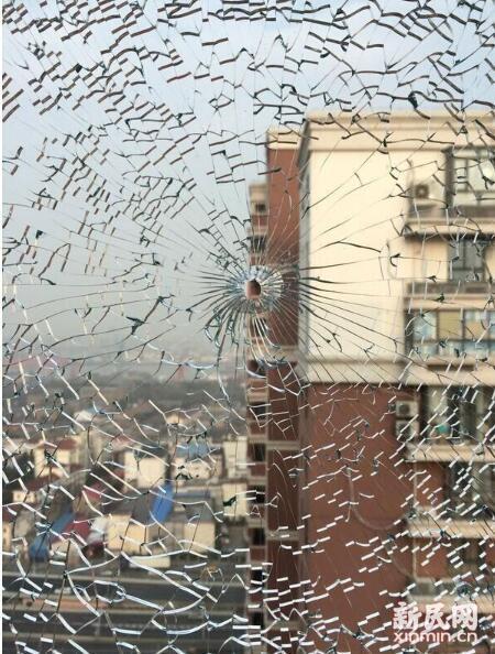 “前天(6日)夜里10点多,我看电视时忽然听到类似铁桶打翻的声音,没怎么在意。”张小姐说,直到孩子大喊“玻璃‘花’了”,他们才发现,钢化玻璃碎裂成蜂窝状,还留有一个圆形弹孔。