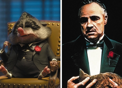 在增加观影趣味方面,埋伏了很多致敬梗,比如设置一个“制毒工作室”时,加入“老白和小粉马上就到”的台词,让《绝命毒师》的粉丝心中一乐;动物城最令人闻风丧胆的黑帮老大鼩鼱“Mr.Big”则致敬《教父》,不仅着装一致,意式英语的口音一致,“大先生”还承诺女儿不在她大婚当天杀“人”。