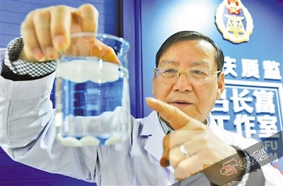 市质监局吕长富工作室,用水检测樟脑丸,质量过关的浮在水面上,问题樟脑丸沉在水底。本报记者 杨新宇 摄