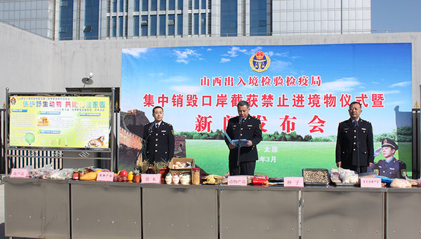 人民网太原3月10日电(赵芳)10日上午,山西口岸集中销毁截获禁止进境物活动举行。“有来自十多个国家和地区的七大类、200多种、近800公斤的商品进行集中销毁。”太原市出入境检验检疫局局长武志明表示,如果检疫出的有害生物发生扩散,将会对我国的农业成产、山西的生态安全造成极大的危害。
