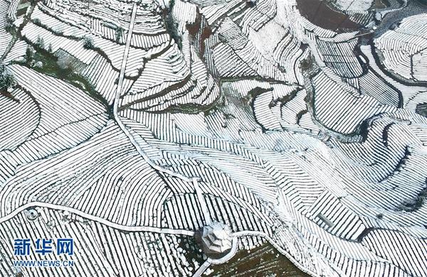 这是3月10日航拍的湖北省宣恩县伍家台村有机茶园雪景。当日10时,中央气象台继续发布寒潮蓝色预警。受寒潮影响,浙江、江西、湖北、湖南、贵州等多地出现明显大风降温和雨雪天气。 新华社发(宋文摄)