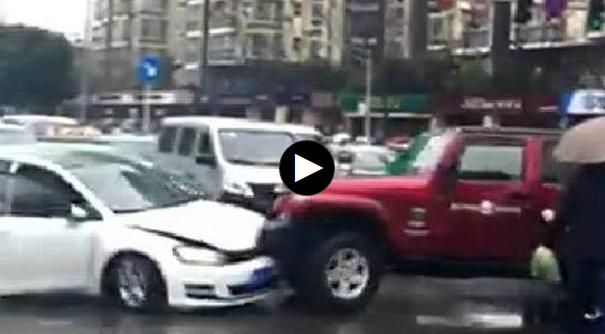 成都两驾驶员斗气互殴,一人驾牧马人撞另一人高尔夫