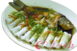 鱼肉加上均安大头菜等,埋入肠粉内蒸熟,淋上葱花和豉油。鲫鱼蒸熟后一同装盘,如同孔雀开屏一般。