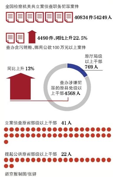 昨天上午,最高人民检察院检察长曹建明向全国人大作工作报告。报告显示,去年检察机关共对41名原省部级以上干部立案侦查,对22名原省部级以上干部提起公诉。