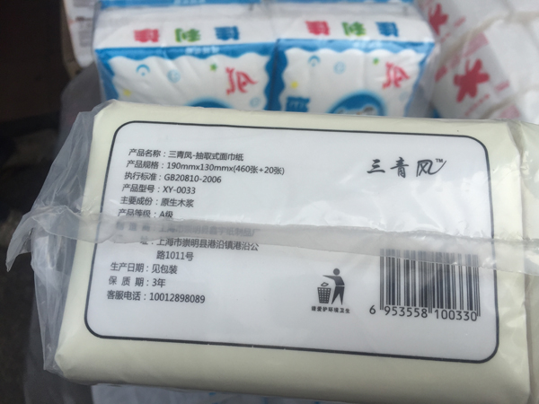 执法人员还发现,这款“三青凤面巾纸”所标注的“位于崇明县港沿镇港沿公路1011号”的生产厂家“上海崇明县鑫宇纸制品厂”,其实是不存在的。“根据我们对涉事厂家的工商信息查询排摸,这款纸巾的厂名厂址是假的。”执法人员表示,要根据经销商提供的厂家联系电话,进一步溯源其生产厂家是否涉嫌违法生产。