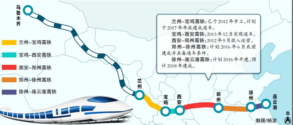 记者了解到,兰州至宝鸡高铁建设已于2012年开工,计划于2017年年底建成通车;宝鸡至西安高铁2013年12月已经实现通车;西安至郑州高铁2012年9月已投入运营;郑州至徐州高铁计划2016年6月底之前建成并具备通车条件;徐州至连云港高铁计划2016年开工建设,工期3年,预计2018年建成。