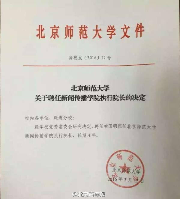 北师大关于聘任新闻传播学院执行院长的决定