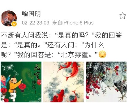 喻国明微博截图,疑似“南下闭霾”