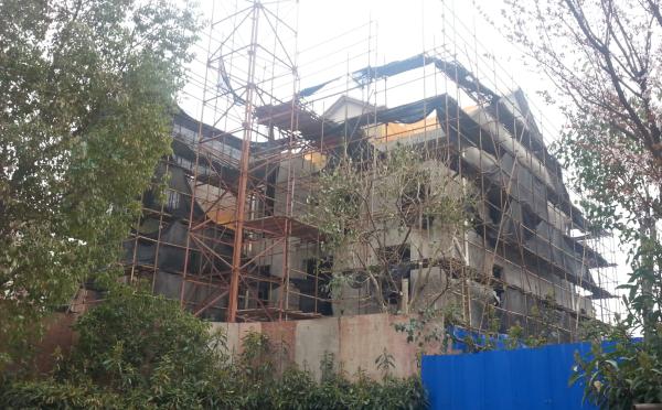 上海青浦区富力桃园102号别墅重建工地,工地竖起一个5层楼高的井架。