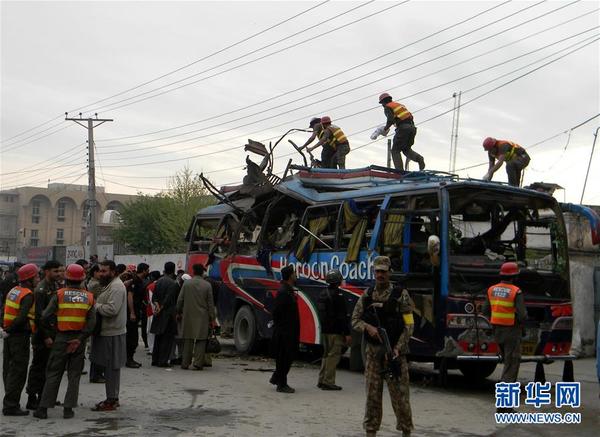 3月16日,在巴基斯坦白沙瓦,安全人员和救援人员聚集在爆炸现场。据报道,巴基斯坦西北部白沙瓦市一政府部门班车当天上午发生爆炸,目前已造成至少15人死亡、28人受伤。 新华社发(艾哈迈德·西迪克 摄)