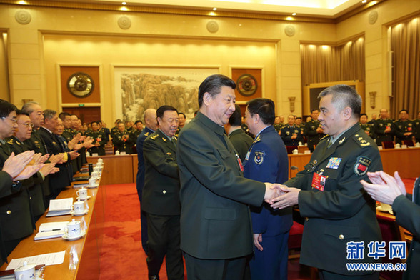 3月13日,中共中央总书记、国家主席、中央军委主席习近平出席十二届全国人大四次会议解放军代表团全体会议并发表重要讲话。这是习近平同军队人大代表亲切握手。新华社记者李刚摄