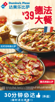 不仅坚持全球品质标准,达美乐还根据中国顾客口味,常常推出新品。本季上市的德法大餐系列,包括德式烤肠比萨和法式龙利鱼比萨。德式烤肠比萨,选用德国首屈一指的图林根香肠,纯手工制作,独特秘方,木炭烤制,口感清香,营养丰富。以BBQ酱作为底酱,出品时淋上甜辣的番茄沙司,并撒上香芹片,香味四溢!法式龙利鱼比萨,肉质鲜嫩、口感爽滑,高蛋白、低脂肪,富含维生素,配上浓郁的黑胡椒酱,经典的法式烹调,以绵糯的美乃滋作为底酱,出品时淋上了黑胡椒酱,并撒上味岛香松,一口难忘!如此美味,现加入物超所值系列,9寸仅售39元!