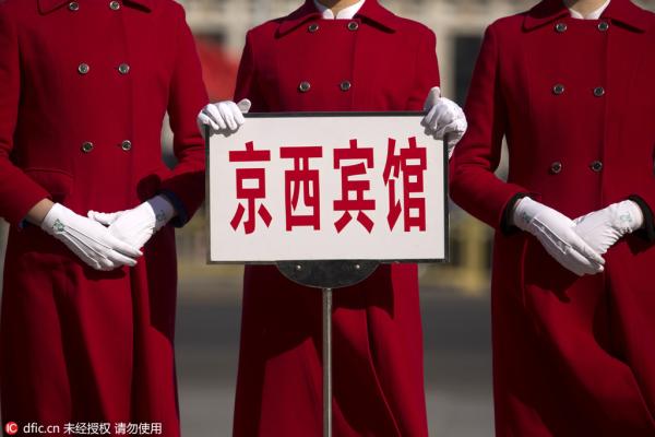 2016年3月9日,北京,2016年全国两会在北京举行。“中国红”美女引导员在天安门广场上排队迎接代表,拿着“京西宾馆”的牌子。 东方IC 图