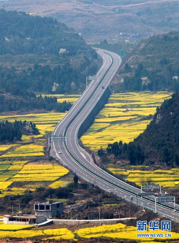 3月17日,贵州安顺一条高速公路两边的油菜花竞相绽放。