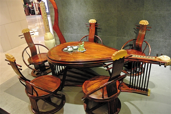 这套产品是罗浮宫家居内明贡轩品牌的新品。这款琵琶茶台采用国家一级木种老挝大红酸枝(交趾黄檀)制成,以中国传统乐器琵琶为设计理念,结合现代人体工程学设计而成。大红酸枝细腻润滑的质感,在充满艺术气息的琵琶作品上更显韵味。