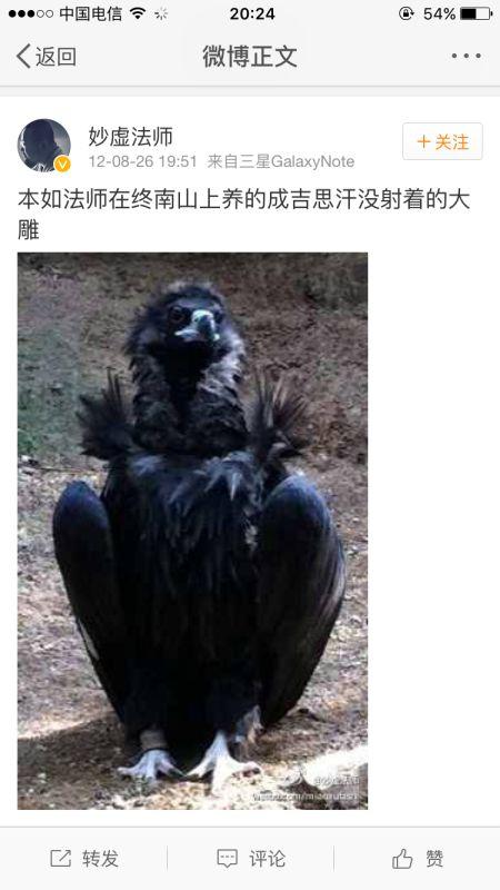 释本如在回信中称,养藏獒是为看寺护院,孔雀、金雕为信众所放生,“该留在寺里它自留,该走的任它走”,而秃鹫则是他从河南救回来的,“待来日,自让它飞翔于苍穹”。