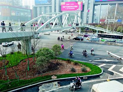今年1月份,武昌区武珞路、中南路口过街天桥建成。作为配套措施,路面机动车道用护栏完全隔离,同时取消了这个丁字路口的3条过街斑马线,天桥的楼梯入口都在人行道、非机动车道内。按照设计构想,行人和电动车过街,不再从斑马线过街,一律上天桥。