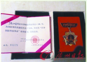 1988年,国防科工委颁发给张士昌的“献身国防科技事业”荣誉证书。