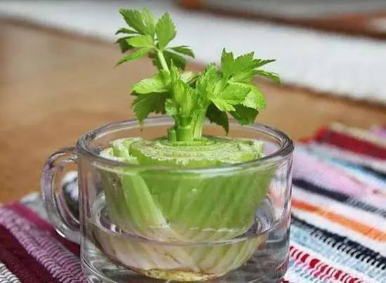 切断旱芹根部,并将它放置在碟子或浅碗中。当叶片开始变稠并从基底中间冒出时,将旱芹转移到土壤中。