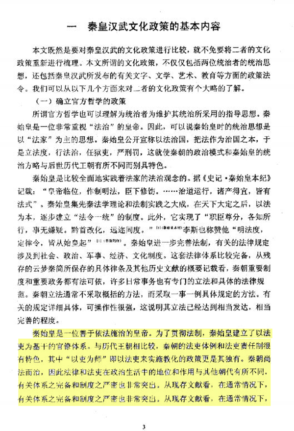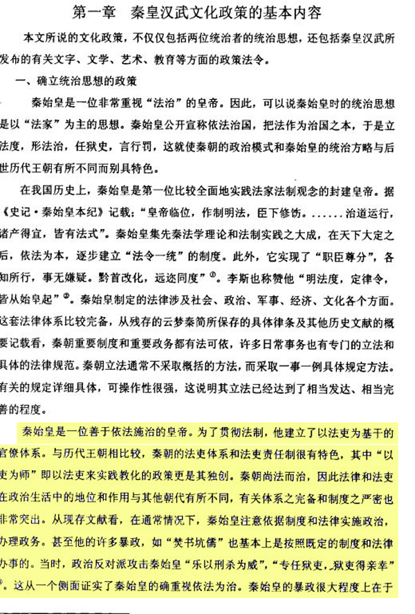 比如孔宇论文第一章第一节写道:“秦始皇是一位善于依法施治的皇帝。为了贯彻法制,秦始皇建立了以法吏为基干的官僚体系。与历代王朝相比较,秦朝的法吏体例和法吏责任制很有特色,其中‘以吏为师’即以法吏来实施教化的政策更是其独有。”