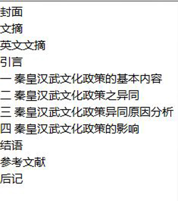 比如从论文结构上来说,孔宇论文共分“秦皇汉武文化政策的基本内容”、“秦皇汉武文化政策之异同”、“秦皇汉武文化政策异同原因分析”、“秦皇汉武文化政策的影响”、“结语”五个部分。