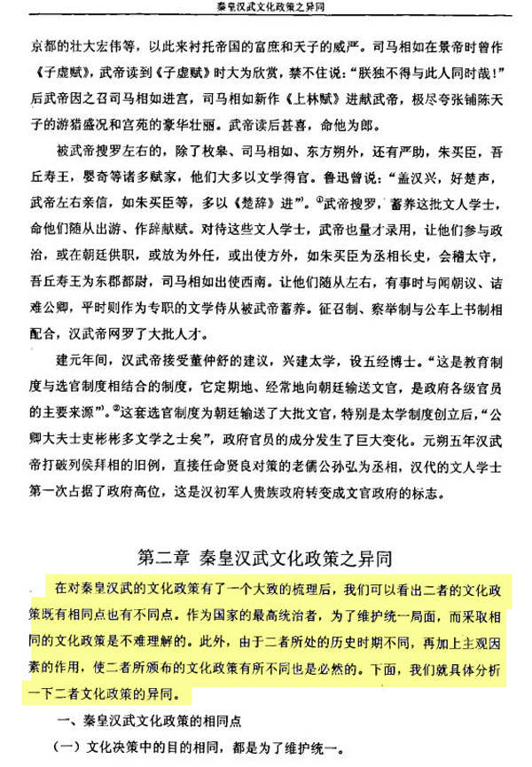在第二章开头部分,孔宇论文则写道:“在对秦皇汉武的文化政策有了一个大致的梳理后,我们可以看出他们二者的文化政策有着相同点和不同点。作为统一帝国的最高统治者,为了维护统一局面,而采取了有相同点的文化政策是不难理解的。此外,由于二者处于不同的历史时期,再加上主观因素的作用使得在不同的历史背景下二者所颁布的文化政策有不同点也是可以理解的。下面,我们就具体分析一下二者文化政策的异同。”