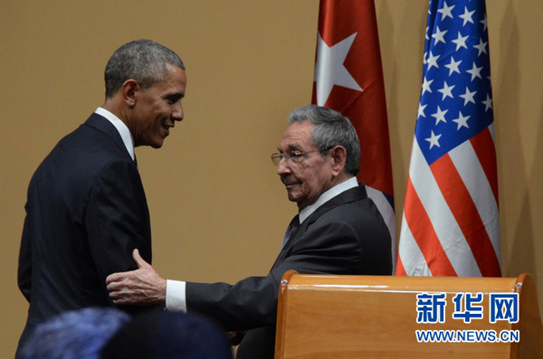 3月21日,在古巴首都哈瓦那,古巴国务委员会主席兼部长会议主席劳尔·卡斯特罗(右)与美国总统奥巴马出席新闻发布会。新华社发