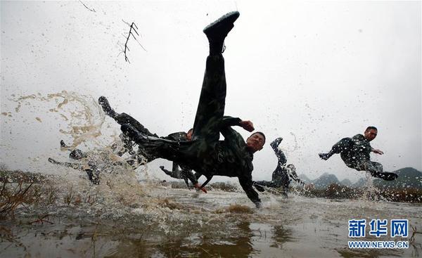 3月22日,武警广西总队桂林支队特勤分队的特勤战士在进行“泥潭搏击”。武警广西总队在3月21日正式拉开广西“魔鬼周”训练的序幕。在一周内,特种队员将完成各种挑战极限的高强度科目,锤炼综合素质。新华社发(文月 摄)