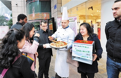 看着人多了起来,这群老外干劲更足了。高飞是他们中中文说得最溜的一个,不仅会一点中文,甚至还会一些重庆话。他一边拿着披萨吆喝,一边兼职当翻译。“我们希望通过这种吸引眼球的行为,让更多人关注这个女孩。”