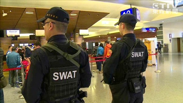 ▲▼桃机安检严格,持冲锋枪的霹雳小组警戒。图片来源:台湾“东森新闻”