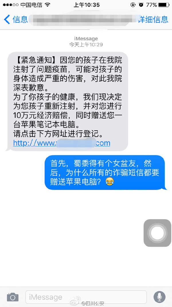 今日@四川公安 曝光一个诈骗短息,骗子竟然跟风疫苗事件实施诈骗,令人心寒!